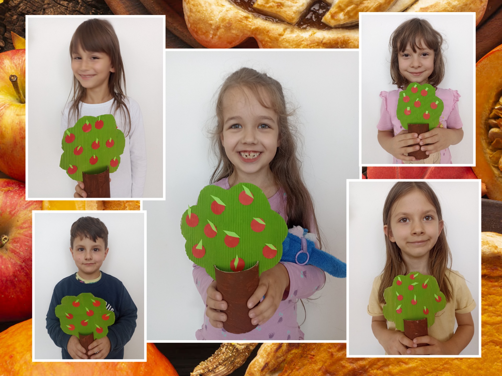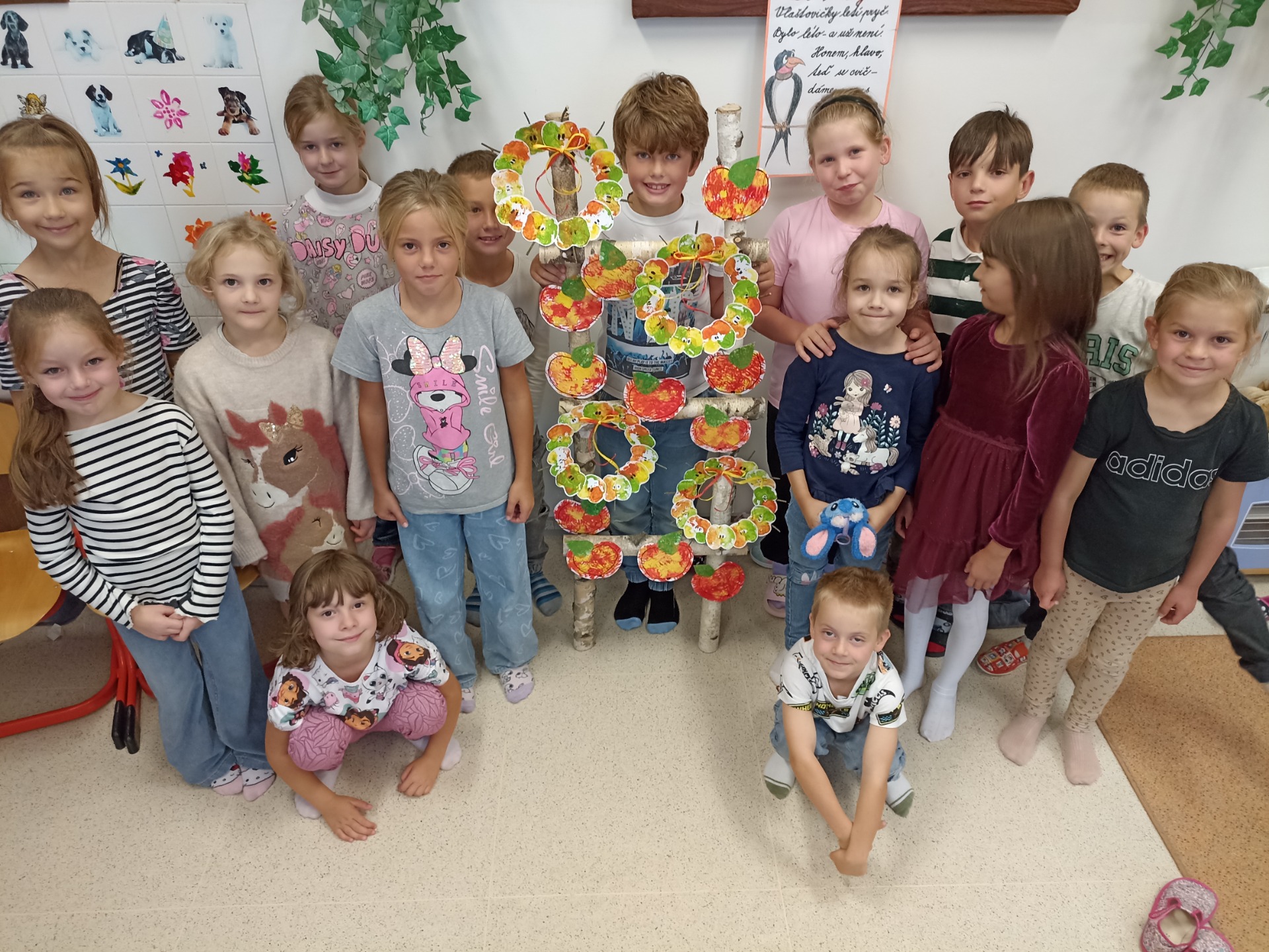 Náš jablíčkový podzim Jablíčka jsou zdravá, chutná a my je máme moc rádi.....a že se jich letos urodilo... Děti obtiskávaly nabarvené poloviny jablíček, ze kterých jsme společně vytvořili věnečky a mladší děti vyrobily krásná jablka pomocí barev a vidličky.