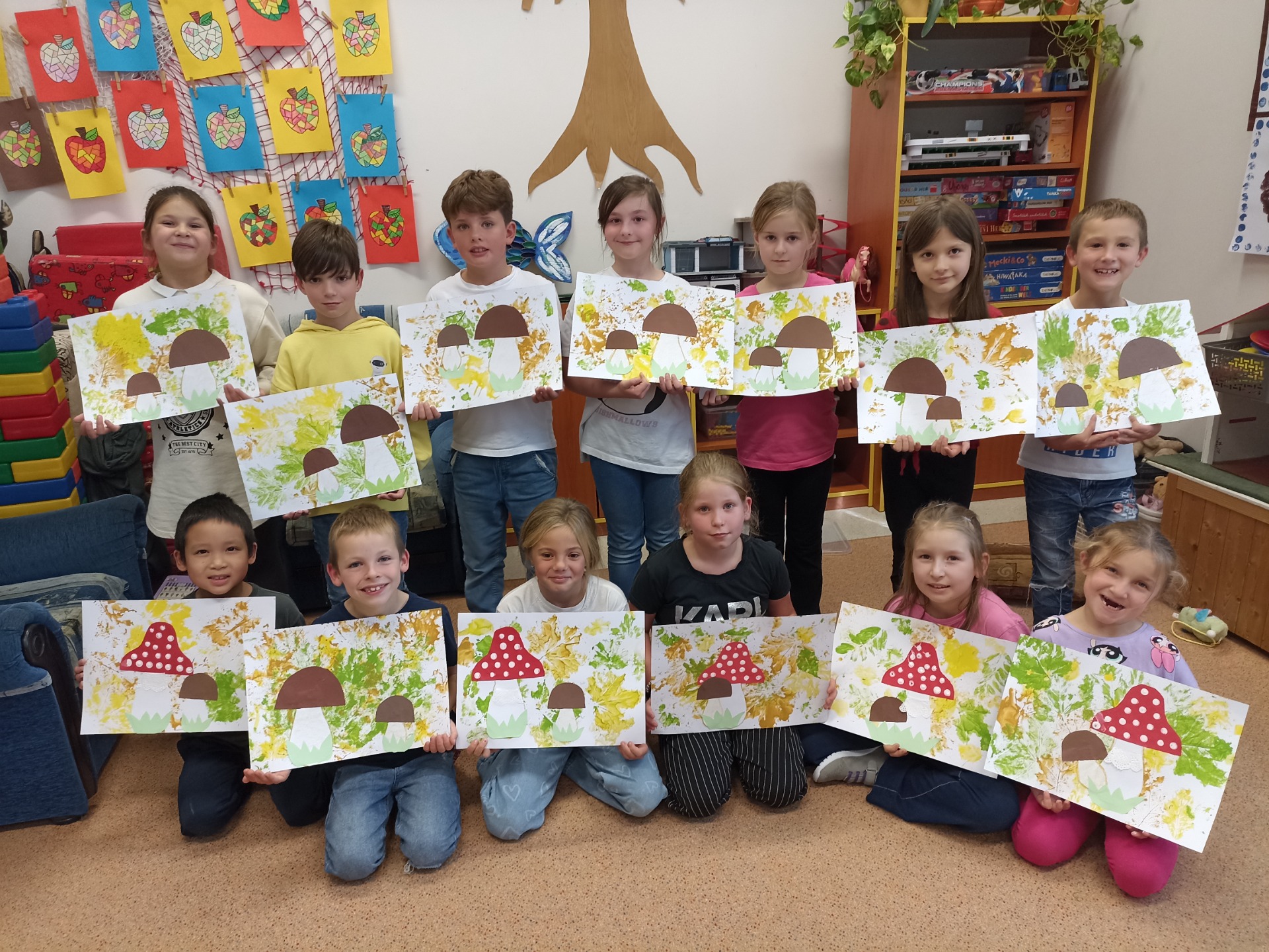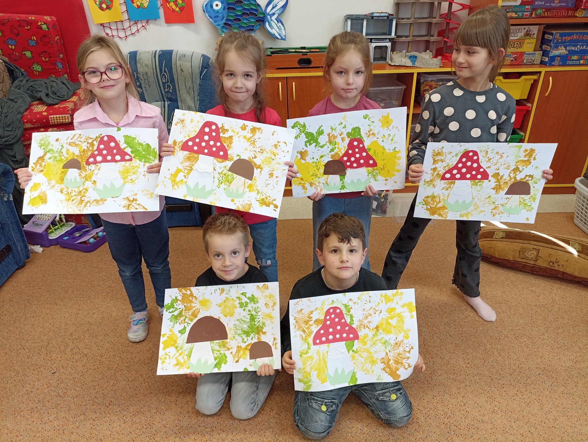 Houby - obtiskávání listů, práce se šablonou, stříhání, lepení. Práce náročná a děti velmi šikovné.