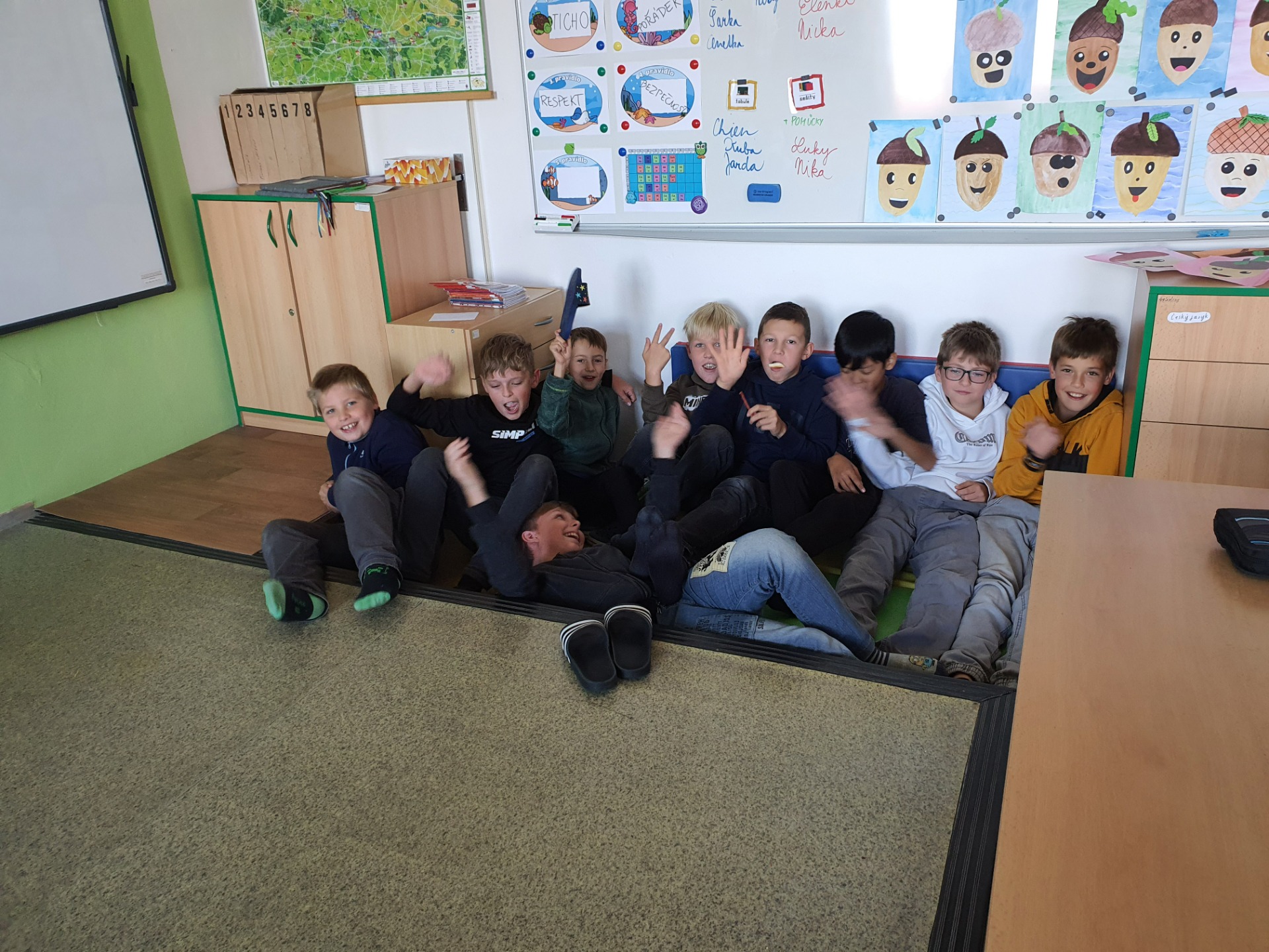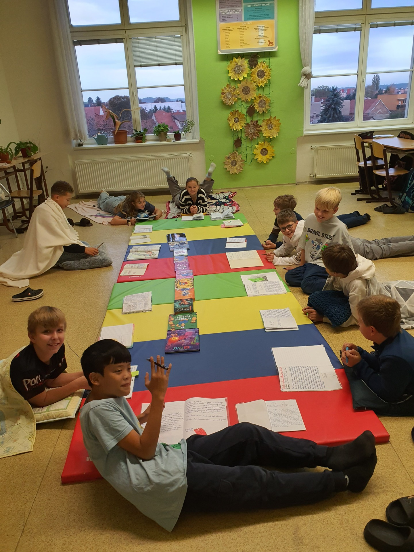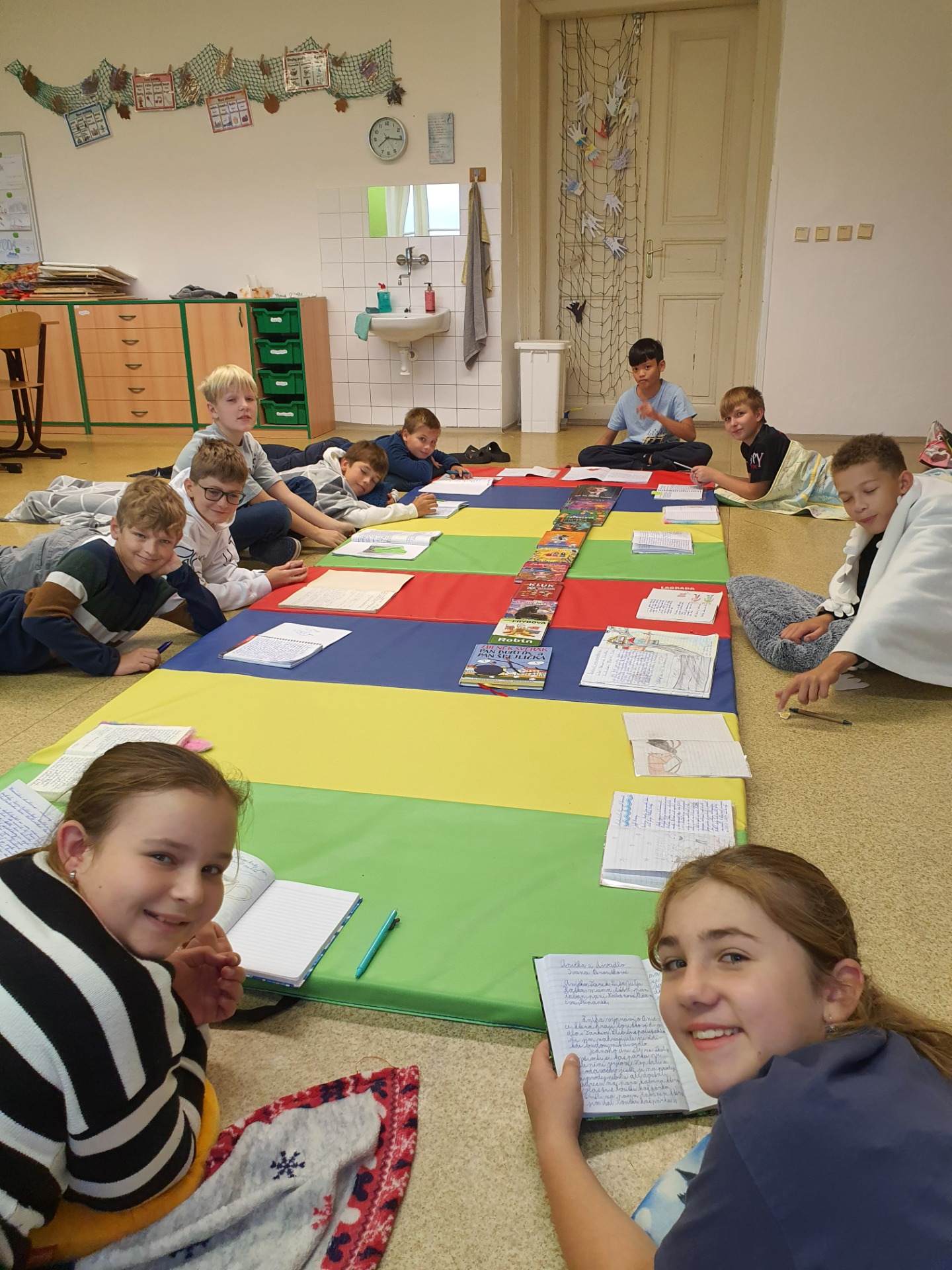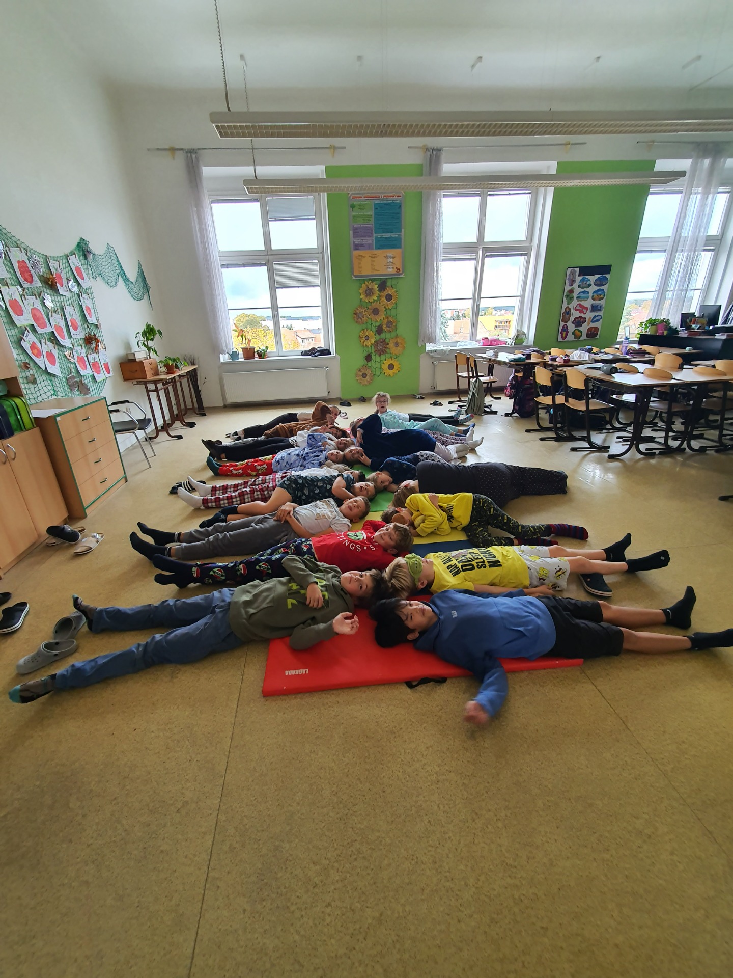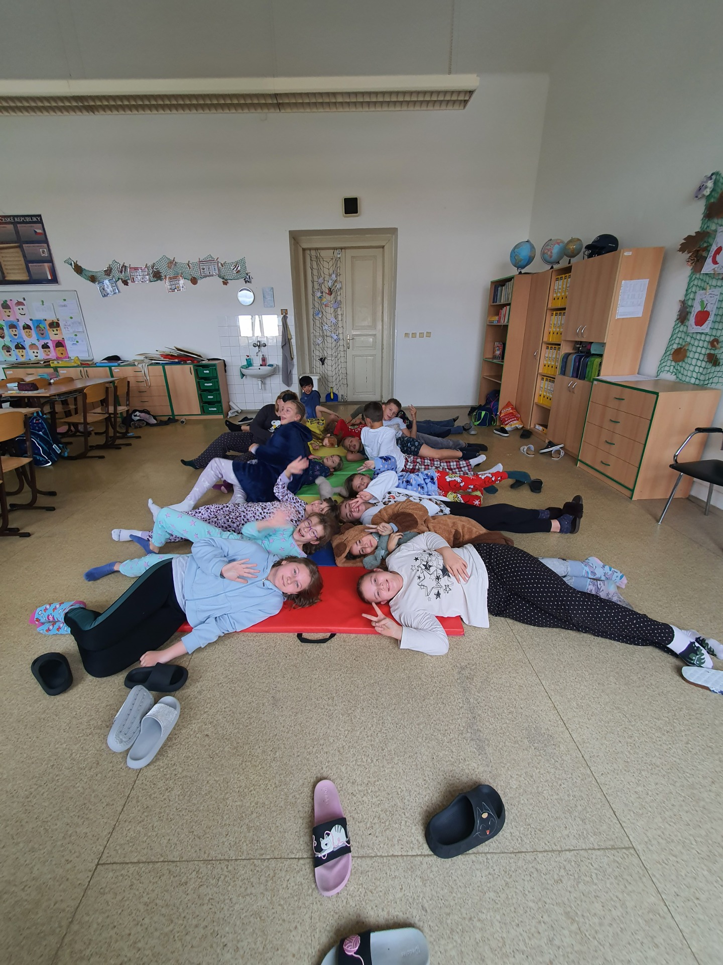 Dnes jsme skoro všichni dorazili v oblečení, které souvisí se spánkem. Proto jsme i poslední hodinu zvolili poslech čtení v leže.