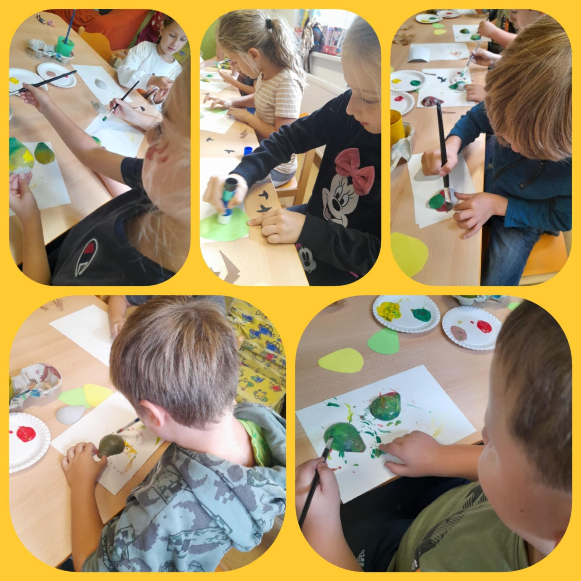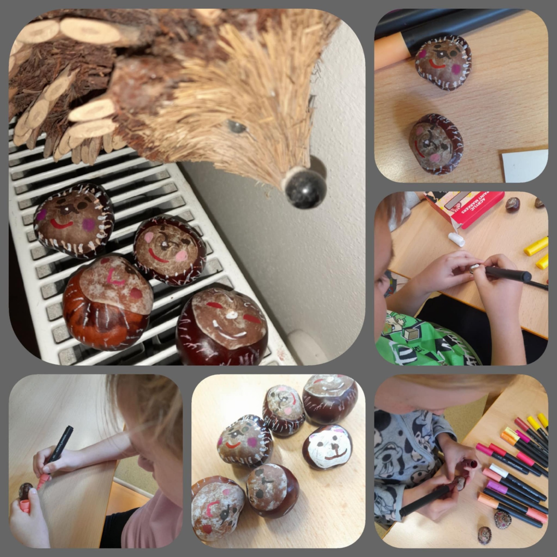 Vzali jsme si kaštany - udělali ježany. Barvičkami pokreslili - u ježka je vystavili. Jsou to malá miminka - hlídá si je maminka:-)