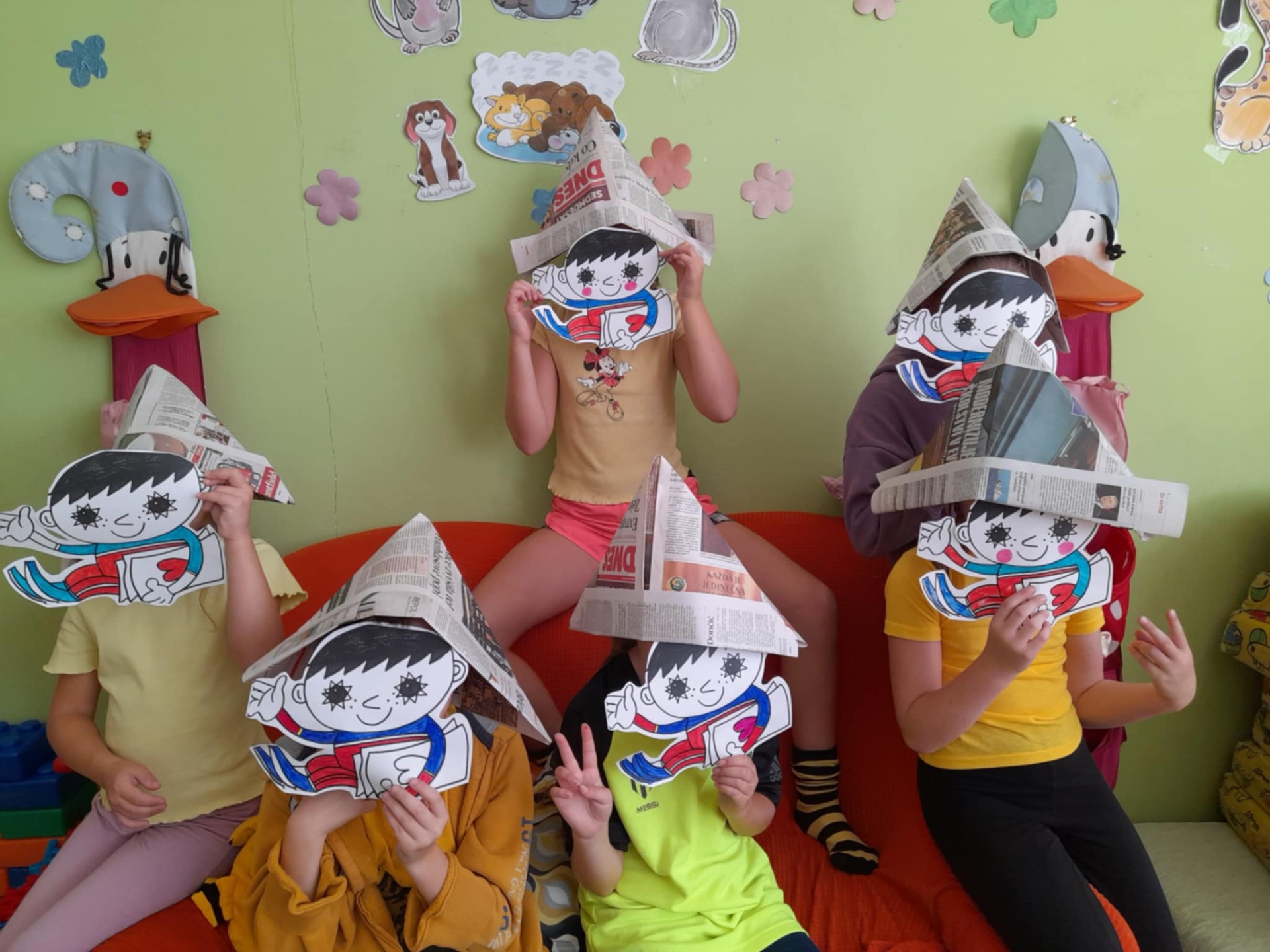 Večerníčky jsme vybarvili a čepičky z novin poskládali ..... a potom si přečetli pohádku - a zařádit si venku jsme také stihli...super...kostičky i myšičky přibyly do kelímků .... paráda