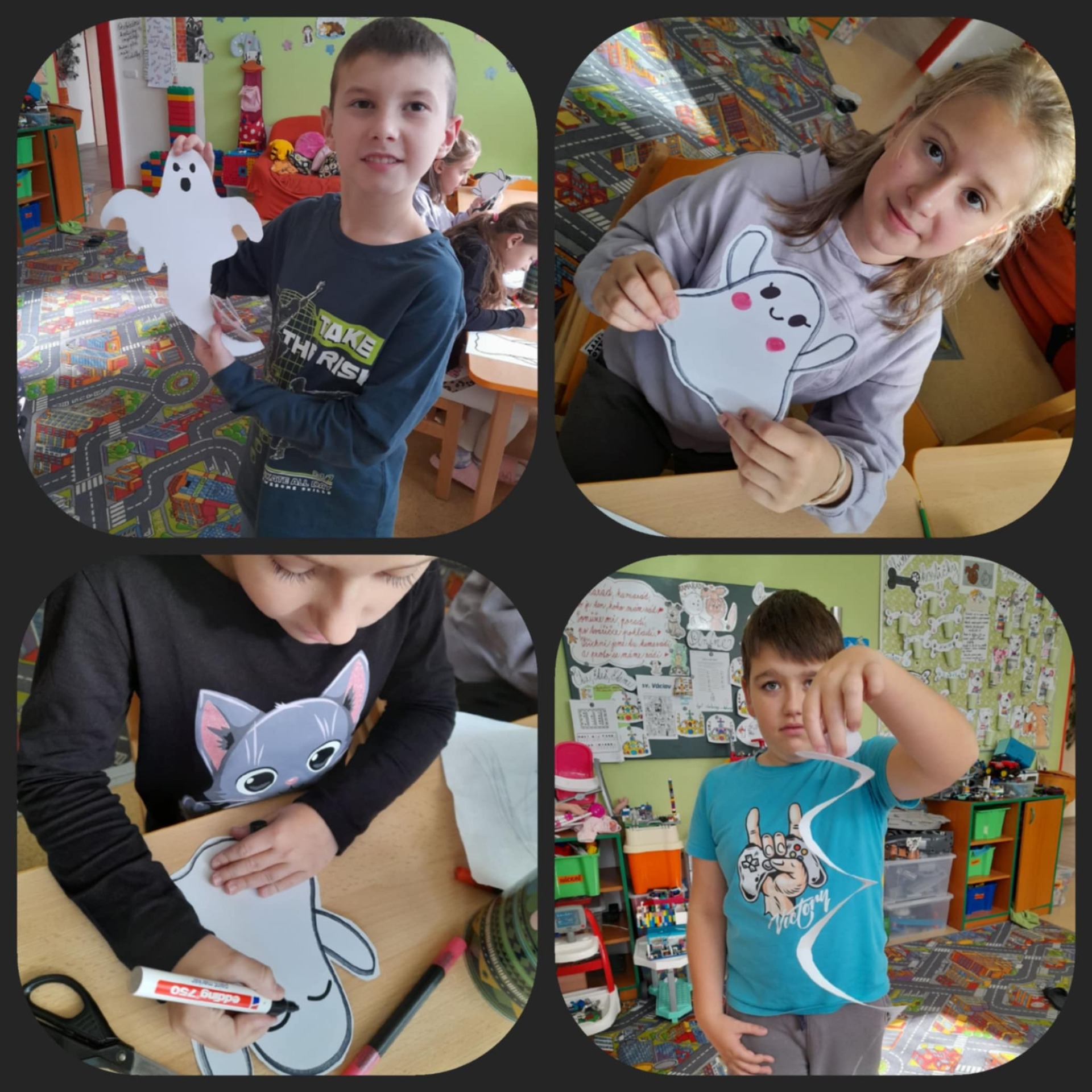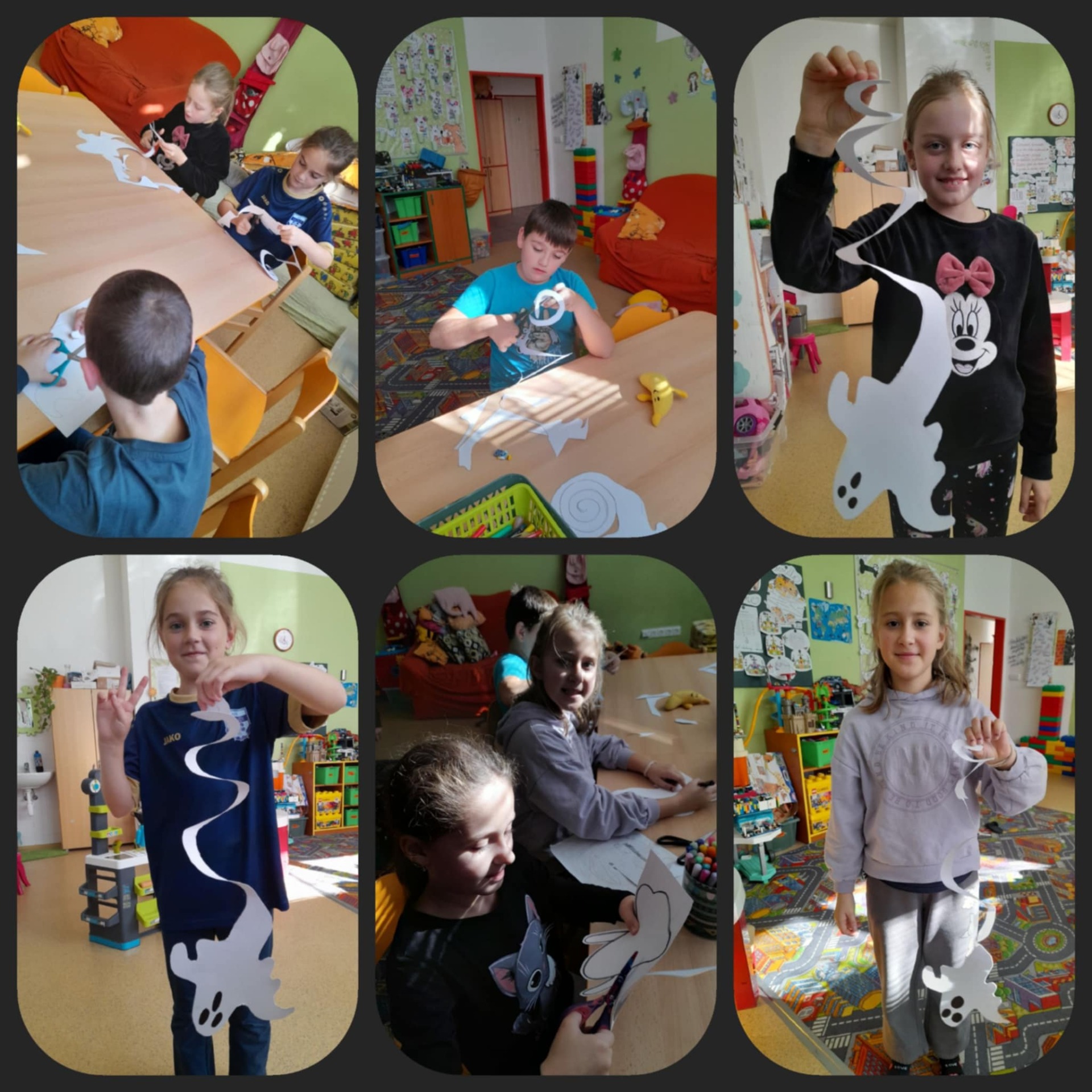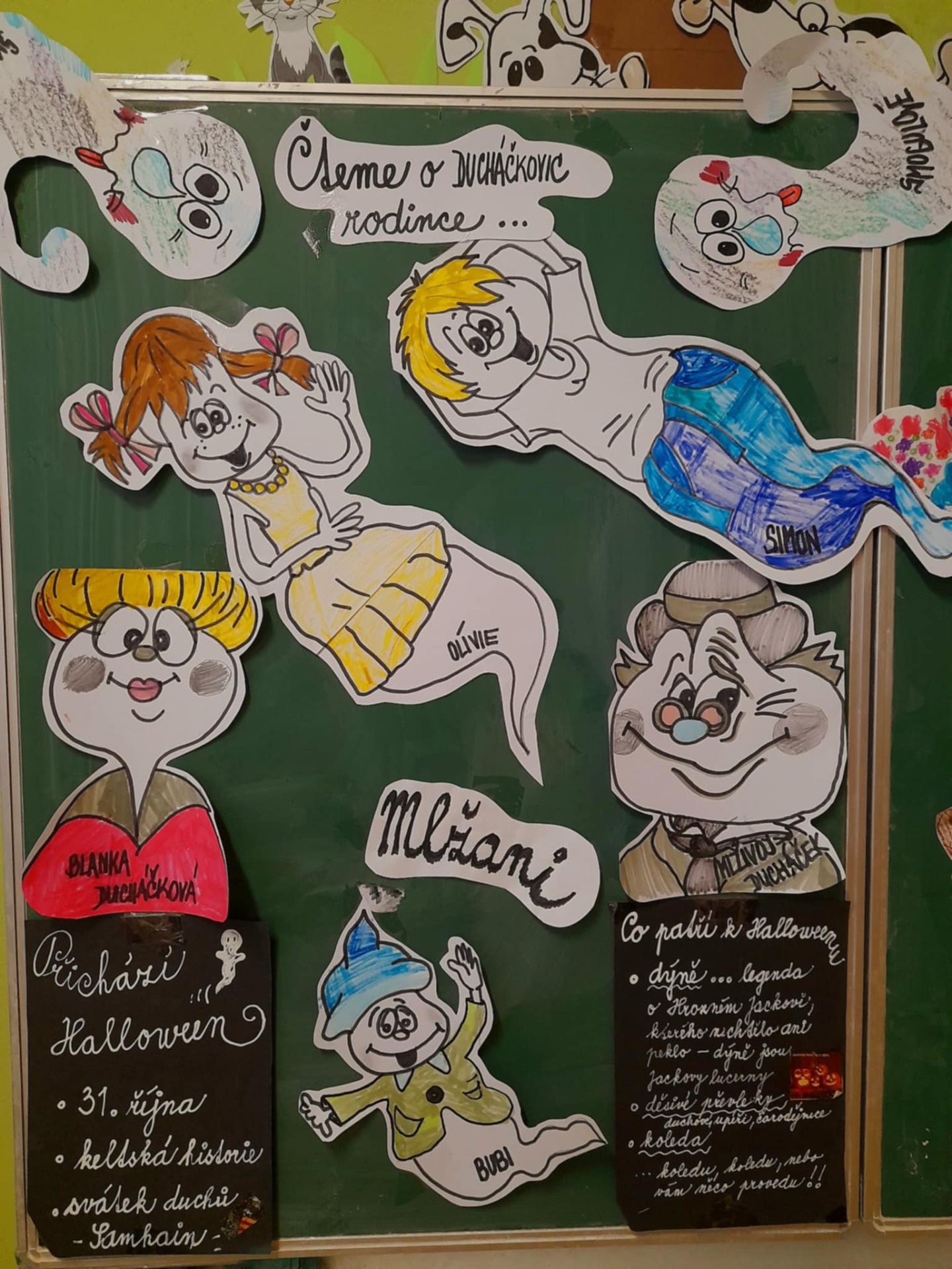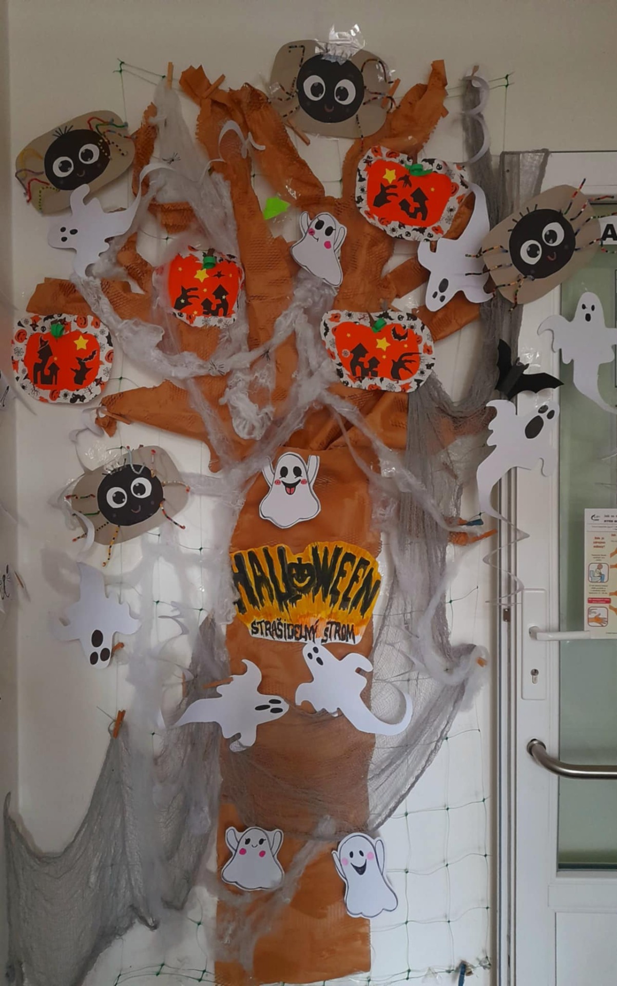 Ve znamení blížícího Halloweenu....příprava Halloweenského strašidelného stromu - ozdoby...dýně, pavouci, duchové......čteme moc hezkou knížku "Ducháčkovic rodinka aneb strašidla mezi námi"